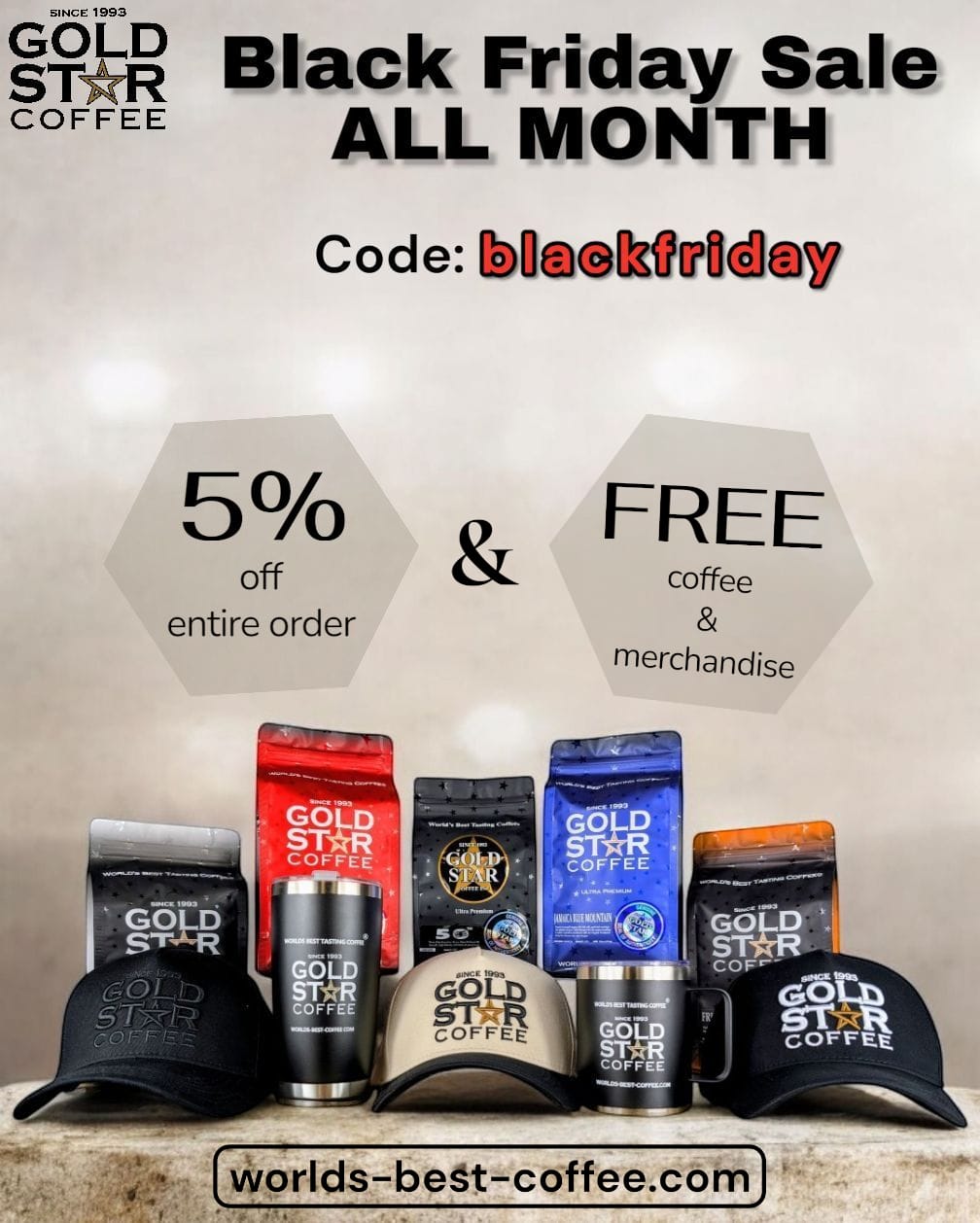 5% off every order - Free Gold Star Coffee promotional merchandise & 1/2lb bag of 50th - 100% Hawaiian Coffee - Kona, Maui & Kauai Pea Berry - Low Acid coffee for every $100 spent. The more you spend, the more free items you receive.